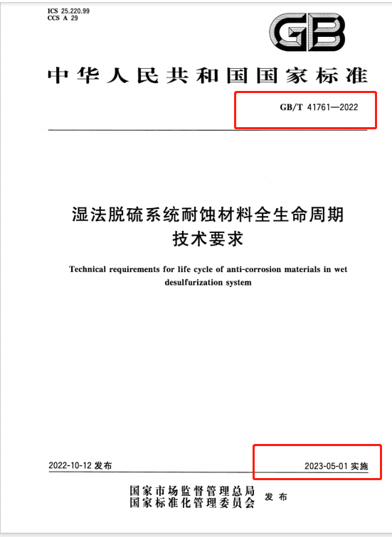 近日,安徽陶博士環(huán)??萍加邢薰咀鳛槠鸩輪挝恢粎⑴c起草制定的國家標(biāo)準(zhǔn)《GB/T 41761-2022 濕法脫硫系統(tǒng)耐蝕材料全生命周期技術(shù)要求》于2023年05月01日正式施行。